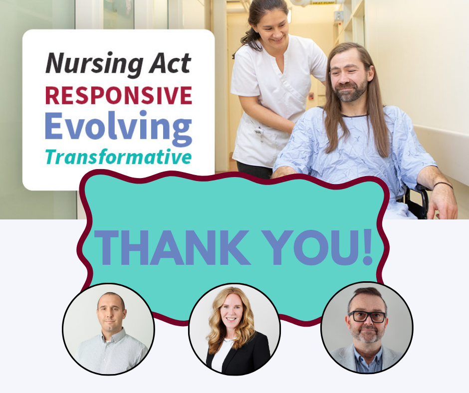 This has truly been a collective effort. Your voices have helped ensure the new Act reflects the realities of nursing today and supports public protection through safe and competent nursing practice.